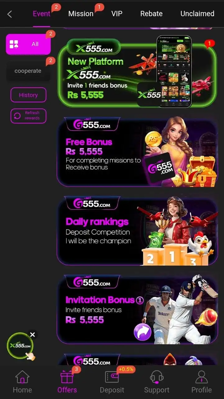 This masterpiece offers different types of famous and popular games like Fortune Gems; you can play them and earn real cash. In addition to this, you will be having bonuses like referral bonuses and daily bonuses. Both types of bonuses will gradually increase as you fulfill the criteria. For referral, if more players join the G555 game by your link, your referral bonus will increase. And for daily bonuses, you have to log in to the game on a daily basis. This is a cool feature that adds free cash to your account.